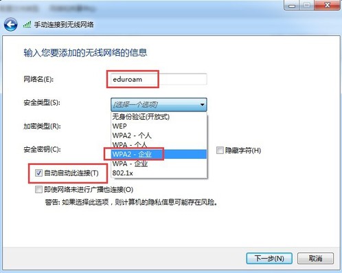 网络名输入【eduroam,安全类型选择【WPA2-企业】,选择【下一步】;