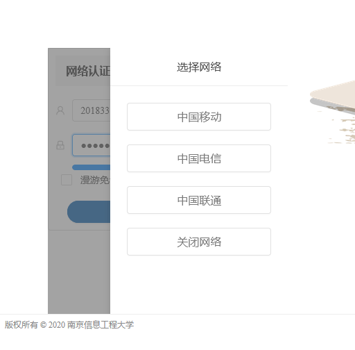 注意1:在身份栏输入的校园网账号需要携带南信大的域名(@nuist.edu.cn)。例如:校园网账号为001650,则在身份栏输入001650@nuist.edu.cn
