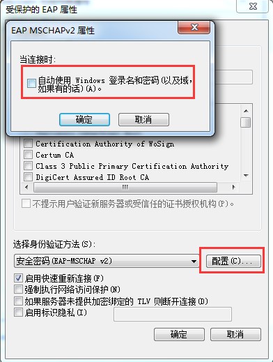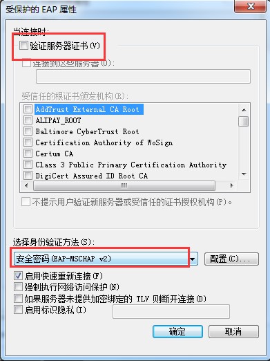 去掉【验证服务器证书】选项,选择【安全密码(EAP-MSCHAP v2)】