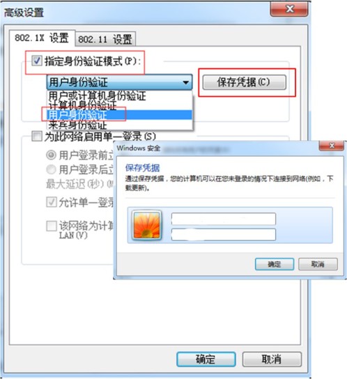 选择【指定身份验证模式】,下拉菜单选择【用户身份验证】。然后点击【保存凭据】,输入南信大eduroam账号和密码,点击【确定】进行保存。