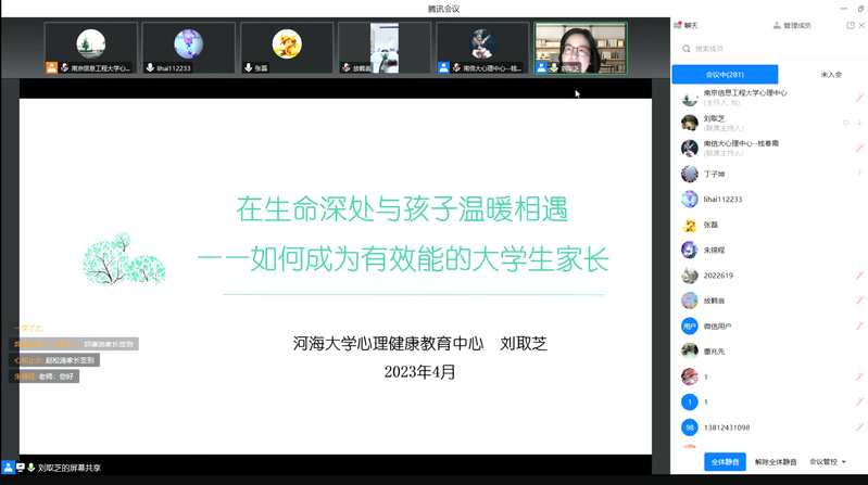为进一步加强家校共育,充分发挥家长在家庭教育中的主体作用,增进家长对学生心理发展特点的科学认识,提升家长的现代教育理念和育人水平。4月14日,心理健康教育中心组织开展“家长课堂:在生命深处与孩子温暖相遇——如何成为有效能的大学生家长”心理健康教育讲座活动。本次由我校心理健康中心主任钱春霞老师主持,河海大学副教授、国家二级心理咨询师刘取芝老师进行讲授,500余名家长通过线上会议及直播的形式参与了本次讲座。