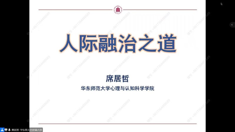 为帮助同学们更好的认识和处理人际关系,掌握与他人相处融洽的方法与技巧,5月10日晚19:00,学工处心理健康中心成功举办了题为“人际融洽之道”的线上主题讲座。本次活动特邀华东师范大学心理与认知科学学院教授,博士生导师席居哲老师与同学们深入交流,吸引百余人踊跃参与。