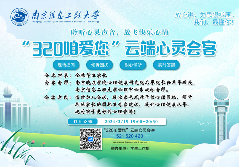 2024年3月20日晚7点,“320咱爱您”云端心灵会客活动在线上如期举行。活动由心理中心钱春霞老师主持,嘉宾是任其平教授,任教授主要从事学校心理学、心理健康教育的研究工作,本次为家长在云端答疑解惑得到了在线家长的热情欢迎。