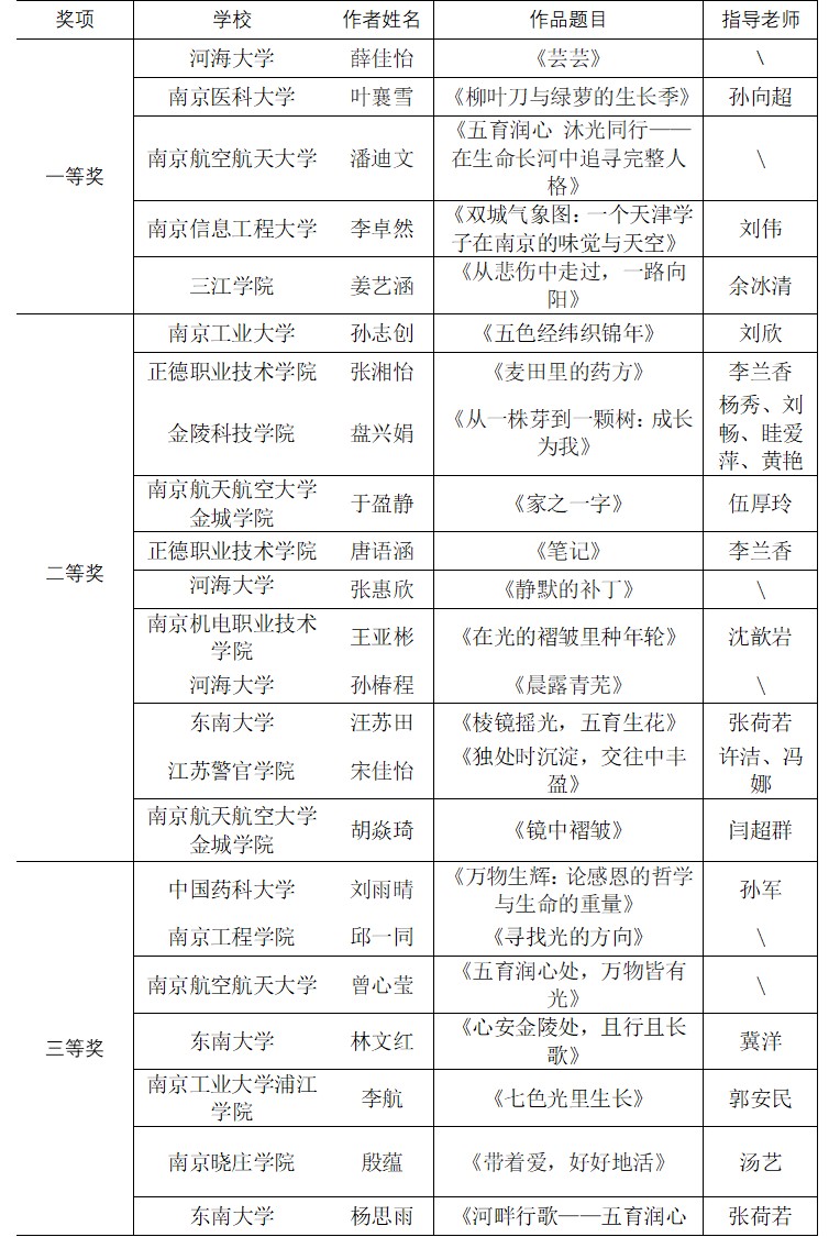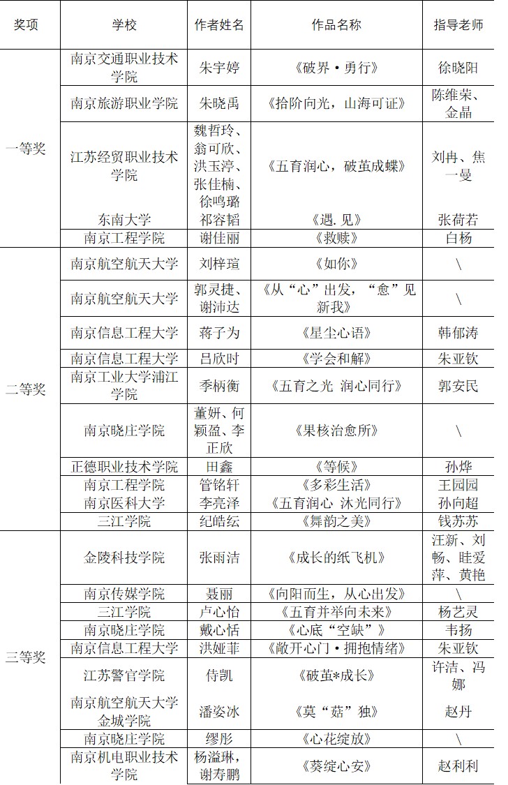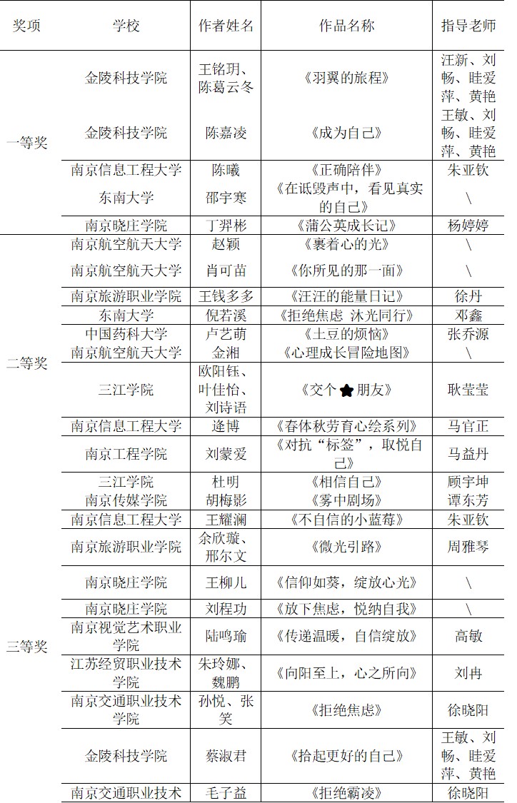 本次大赛由江苏省江宁大学城大学生心理健康教育研究中心主办、南京信息工程大学承办,以“五育润心 沐光同行”为主题,鼓励大学生们进行心理征文及心理漫画、心理海报的创作。最终共收到江宁大学城各学校参赛征文66份,评出一等奖5个,二等奖11个,三等奖19个;心理漫画和心理海报作品共114个,心理漫画评出一等奖5个,二等奖10个,三等奖20个;心理海报评出一等奖5个,二等奖10个,三等奖20个。学生们透过作品,表达出了自己真挚的情感和传递积极向上的力量。
