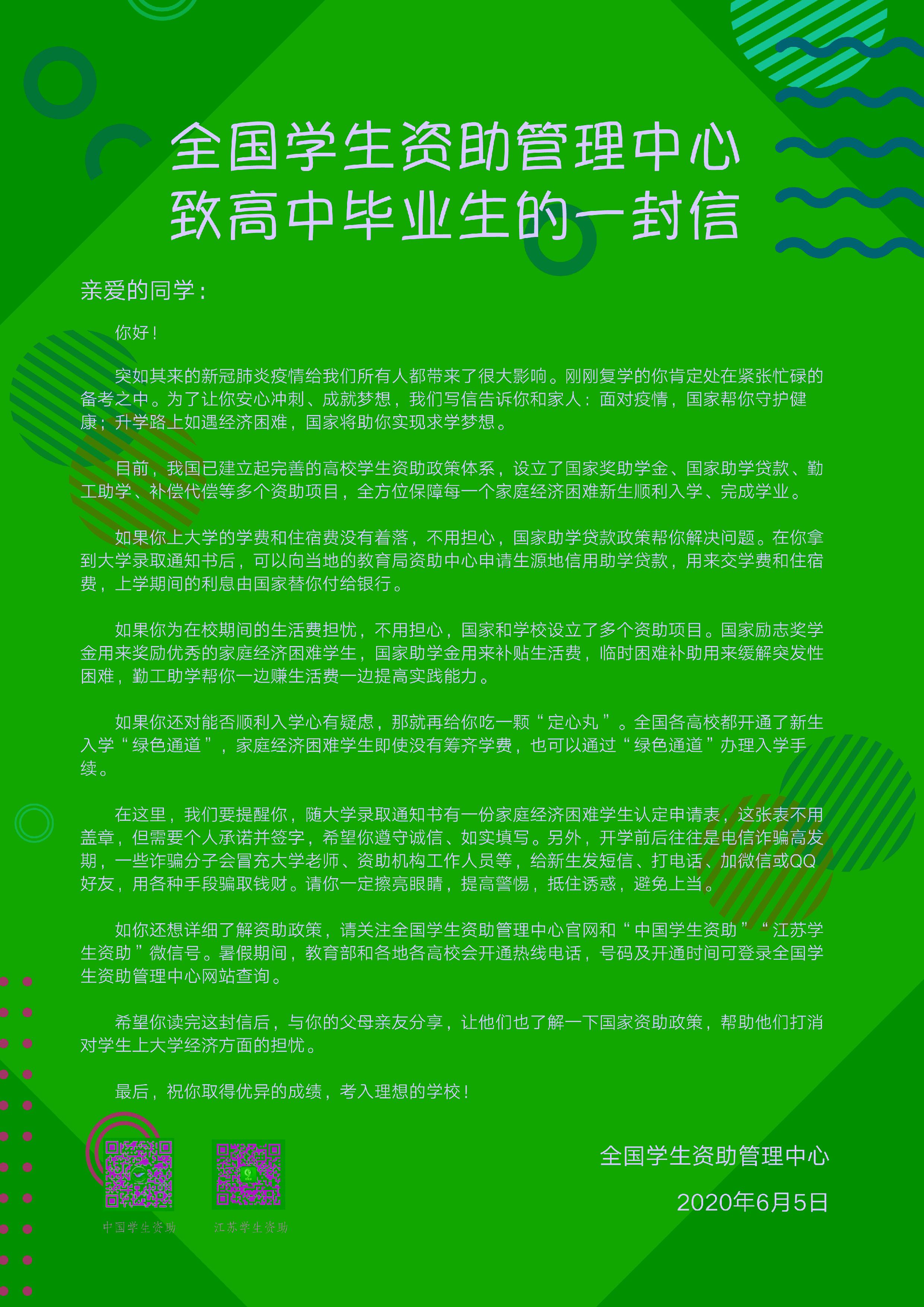 全国学生资助中心致高中毕业生的一封信