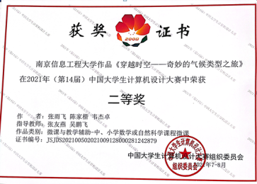 中国大学生计算机设计大赛按照校赛、省赛、国赛三级赛制展开。因为疫情的影响,2021年,大赛全国总决赛于2021年7月到2021年8月在各分会场的网上举办。文学院微课队“穿越时空——奇妙的气候类型之旅”过关斩将,获得了国赛二等奖的好成绩。本节微课是一节面向初中一年级学生的气候类型介绍课程。微课通过“身临其境”的视角,在领略自然风光的同时,讲授热带四种气候类型特点及成因,兼具知识性与趣味性。通过此次大赛,同学们表示,设计大赛让他们在各个方面都得到了锻炼和提升,受益匪浅。