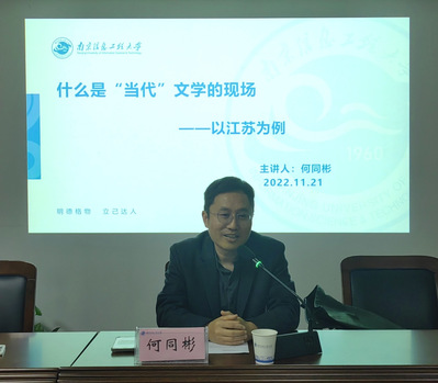 何同彬首先就当代文学空间无限、延展性强的特征,表明文学创作要基于严肃的研究立场介入文学现场,打开封闭系统,贴近真实生活。接着从五方面阐释当代文学现场的构成与要点:一、大学学院,即当代文学现场的重要组成部分,认识到学院提供的优势与局限性并寻求突破;二、作家协会,即中国文学体制下的宝贵产物,要坚定当代文学现场的意志性;三、各类民间组织与文学社团,贡献着论争;四、新媒体与网络文学,即当代文学中最重要的现象,在高科技新媒体影响下产生了人的新尺度;五、各大文学奖项与读书会,激励与诱导着文学现场的发展。何同彬先生认为文学观念远离文学现场必然会受牵制,认为对当代文学的理解不应该被困于陈旧观念之下,被框定在规定的美学范畴内,呼吁同学们要充分运用当代意识,切近潮流进行文学研究。