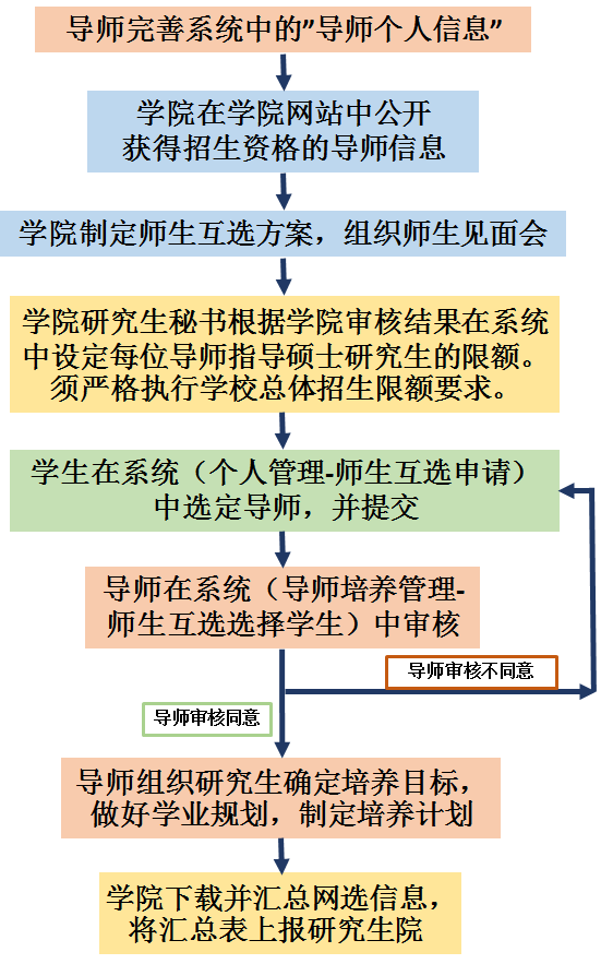 9月26日前导师在学生提交后应及时在系统(系统路径:导师培养管理-师生互选选择学生)中审核,以免影响学生的二次选择。研究生确定导师后,研究生导师应组织研究生确定培养目标,做好学业规划,制定个人培养计划。