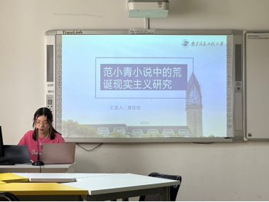 蒋恬恬汇报的题目是《范小青小说中的荒诞现实主义书写研究》,介绍了范小青荒诞现实主义书写的叙事策略、主旨建构,阐述了下一步的论文计划,也分享了写作过程的困难与不足。
