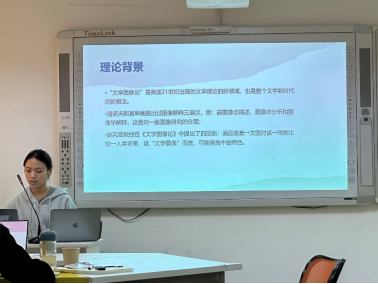 刘钰姝同学首先做了《中国当代小说的残障隐喻研究》的学术汇报,她翻阅了当代60余本残障小说,从残障与隐喻的联系,中国当代小说残障的道德隐喻,当代小说中的残障社会文化隐喻及中国当代小说残障的哲思隐喻四个方面进行了汇报。