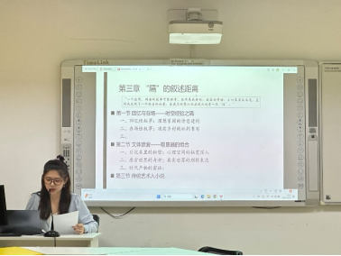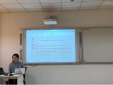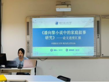 尹心怡同学汇报题目为《鲁敏小说中的城镇化书写研究》,她从城镇化转型中的人文环境,城乡转化中的边际人文化形象,隔的叙述距离,鲁敏城镇化书写的意义及可能四个方面来研究鲁敏小说中的城镇化书写。