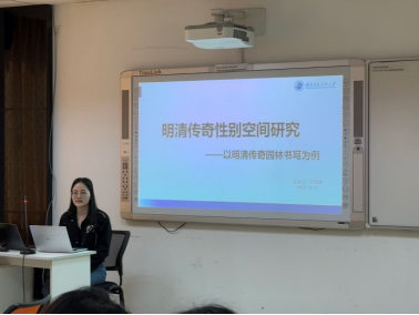 胡雯婕同学汇报题目为《明清传奇性别空间研究——以明清传奇园林书写为例》。她引入“园林公共性”概念,从性别空间书写的权力结构、叙事艺术、空间美学、嬗变动因四个方面,探讨了明清传奇园林书写的性别空间研究。