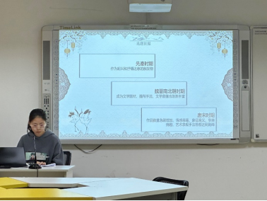 杨佳雯同学汇报题目为《宋前诗歌雪意象抒写》,她分享了自己选题的依据与已掌握的研究现状,并搭建起初步的论文框架,探究了“雪”意象的起源、发展、象征意义等内容。