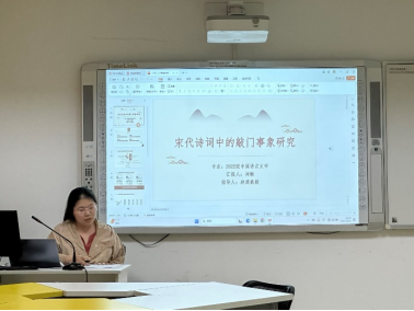 刘畅同学汇报题目为《宋代诗词中的“敲门”事象研究》,她以敲门事象为切口,梳理敲门事象在宋代诗词中的表现,对敲门事象进行主题类型归类,研究宋代诗词中敲门事境的哲学关照,以敲门事象的视角看宋代诗词的新变。