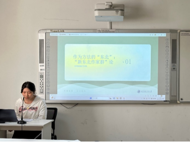 石钰同学汇报题目为《作为方法的“东北”:“新东北作家群”论》。她从被重构的东北,新东北作家群的文化诉求,审美诉求,情感结构及对当下的贡献五个方面论述了新东北作家群。