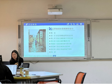 贺艳珠同学的汇报题目为《语言生态视域下江西省中国历史文化名镇名村语言景观研究》。她的研究对象为江西省中国历史文化名镇名村语言景观,采用田野调查和问卷调查法,从语码取向、语言呈现、置放、参与者、功能、建设提升策略六方面分析了江西省语言景观的研究设计。