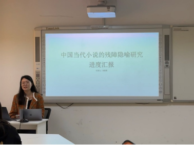 王帅同学做了《中国20世纪90年代以来小说残障身体书写研究》的学术汇报,她从由障致残和由残致障两方面,讲述了残障身体的自主言说与主体塑造,分析了残障身体书写的意义。