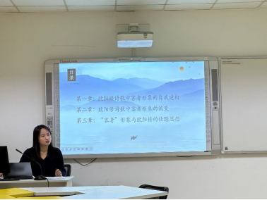 吕晨同学汇报题目为《欧阳修客者形象的流变及其思想意蕴》,她以欧阳修诗歌为研究对象,探讨欧阳修诗歌中客者形象的自我建构、客者形象的流变,并衍生出“客者”形象与欧阳修仕隐思想的辩证思考。