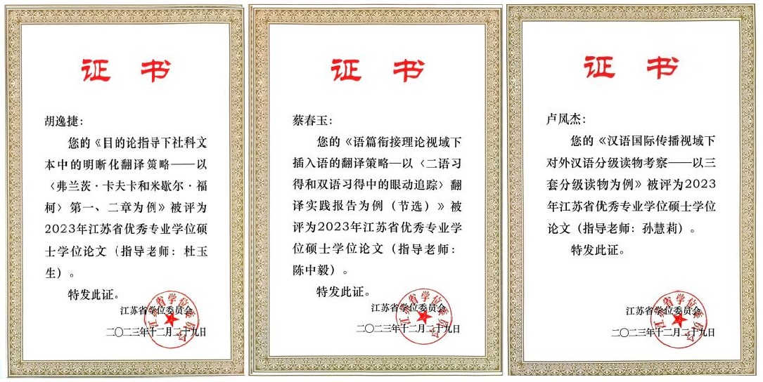 2020级硕士研究生蔡春玉(导师:陈中毅)的硕士学位论文《语篇衔接理论视域下插入语的翻译策略—以<二语习得和双语习得中的眼动追踪>翻译实践报告为例(节选)》被评为2023年度江苏省优秀专业学位硕士学位论文。
