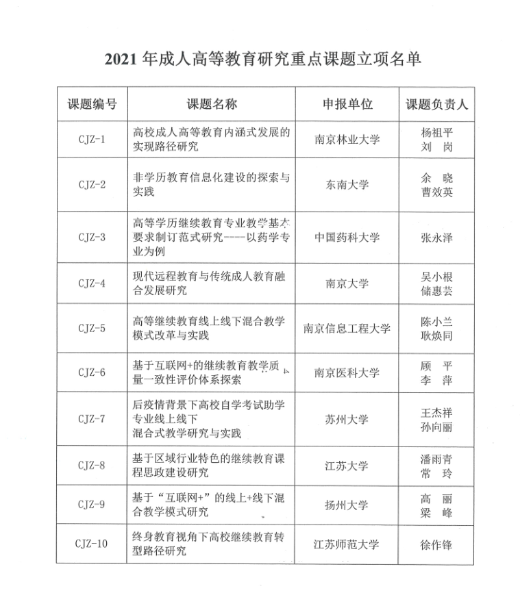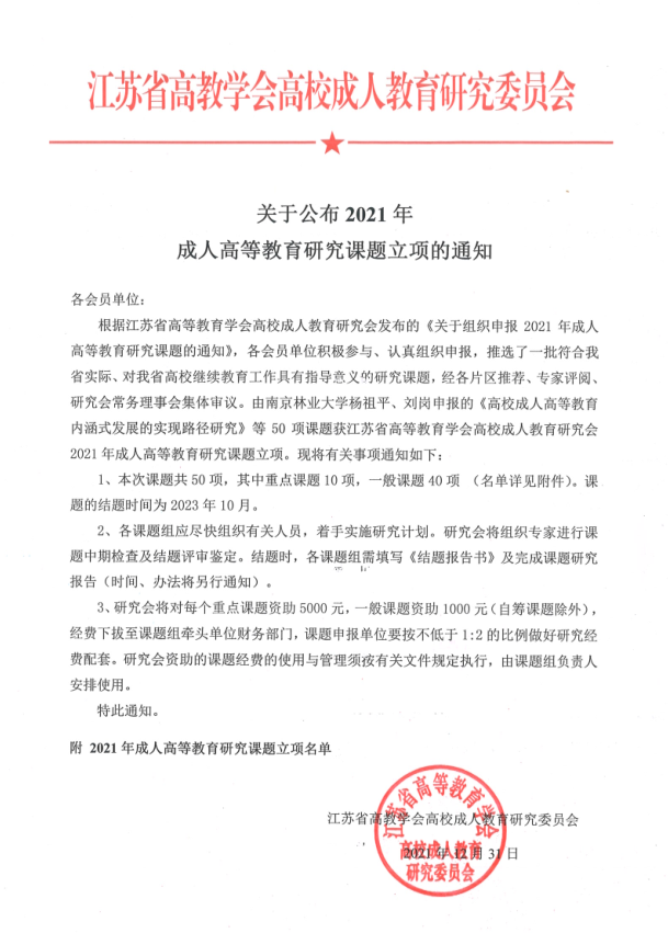 近年来,学院不断强化内涵建设,贯彻落实党的十九届五中全会关于“加强基础研究、注重原始创新”的指示精神,结合继续教育实际工作,不断加强对继续教育发展的前沿性、创新性研究。近期,从江苏省高教学会高校成人教育研究委员会传来喜讯,我院《高等继续教育线上线下混合教学模式改革与实践》课题,获得重点课题。学院将不断加大对课题的研究支持力度,推进课题按期、保质开展并结题。