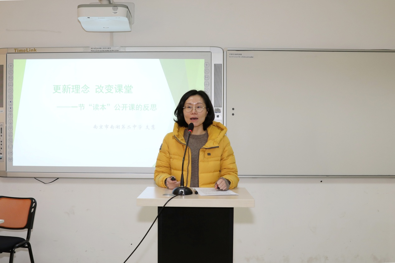 在教学展示环节,南湖二中道德与法治学科教研组长支慧老师围绕初中思政课教学进行说课。她从教学设计、故事情境、小组活动等方面介绍了初中思政课的课程设计与教学,就如何针对中学生的特点进行合理教学,分享了自己教学经验和体会。
