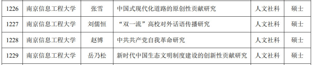 张雪申报的《中国式现代化道路的原创性贡献研究》、刘儒恒申报的《“双一流”高校对外话语传播研究》、赵博申报的《中国共产党自我革命研究》、岳乃松申报的《新时代中国生态文明制度建设的创新性贡献研究》,以清晰的研究思路,较强的逻辑论述,较好的前期积累,最终获得立项。