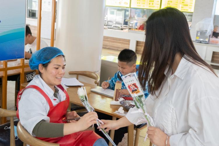 随后,党员同志们将提前亲手制作好的幸福花束,附上劳动节祝福,送给节假日期间仍在岗位劳动的人,致敬每一位在平凡的岗位默默奉献的劳动者。这些辛勤的工作者们接过花束,回馈给我们灿烂的笑容,并表达了感激之情。无论风吹日晒,还是寒来暑往,他们都工作在学校的各个角落,正是因为有他们,学校才这么清洁、舒适、安全、温暖。