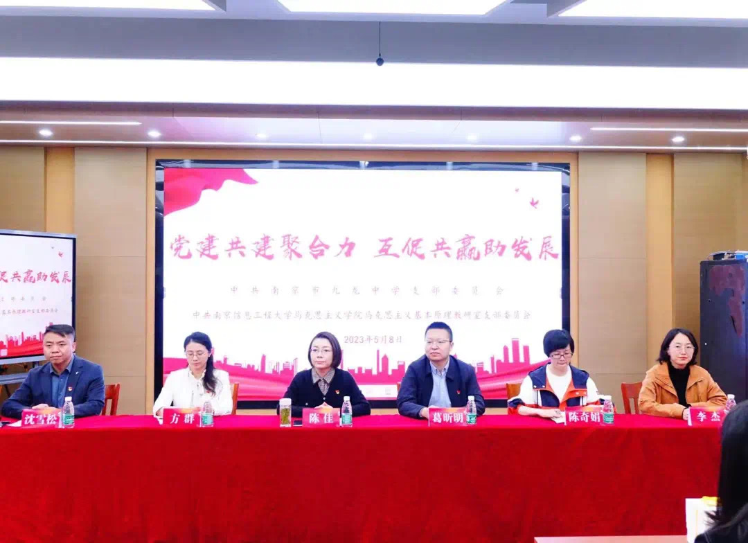 江北新区教育和社会保障局党群工作办主任陈佳,南京市九龙中学党支部书记、校长沈雪松,党支部副书记、副校长汪建,我院党委书记葛昕明、副书记副院长方群、马原教研室党支部书记陈奇娟参加签约仪式。南京市九龙中学全体党员、部分团员、青年教师、少先队员代表和我院研究生代表参加了活动。