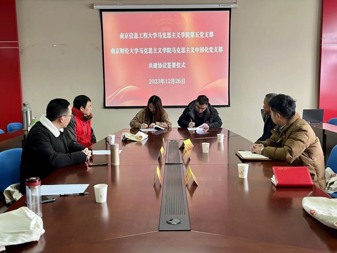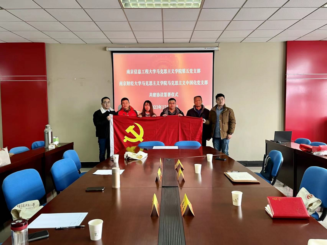 12月26日上午,南京信息工程大学马克思主义学院第五党支部与南京财经大学马克思主义学院马克思主义中国化党支部在南京财经大学德正楼508会议室举行结对共建仪式。南京信息工程大学马克思主义学院第五党支部书记许川川、教研室主任张齐、贾后明教授,南京财经大学马克思主义学院马克思主义中国化党支部书记黄继红、教研部主任杨荣刚、于海量教授出席仪式,结对共建仪式由黄继红主持。