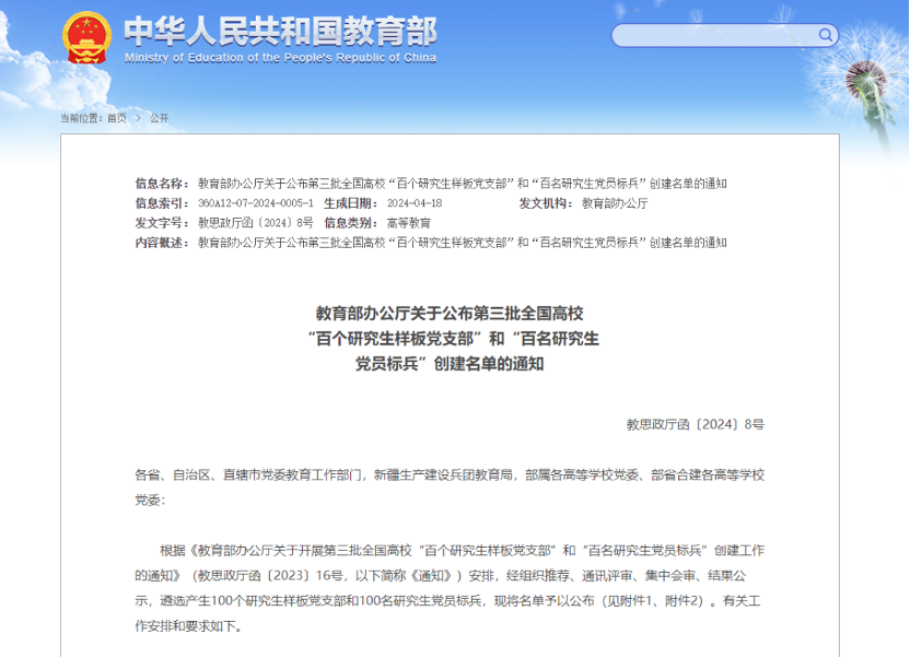 近日,教育部公布了第三批全国高校“百个研究生样板党支部”和“百名研究生党员标兵”创建名单,马克思主义学院研究生党支部入选全国高校“百个研究生样板党支部”创建单位。