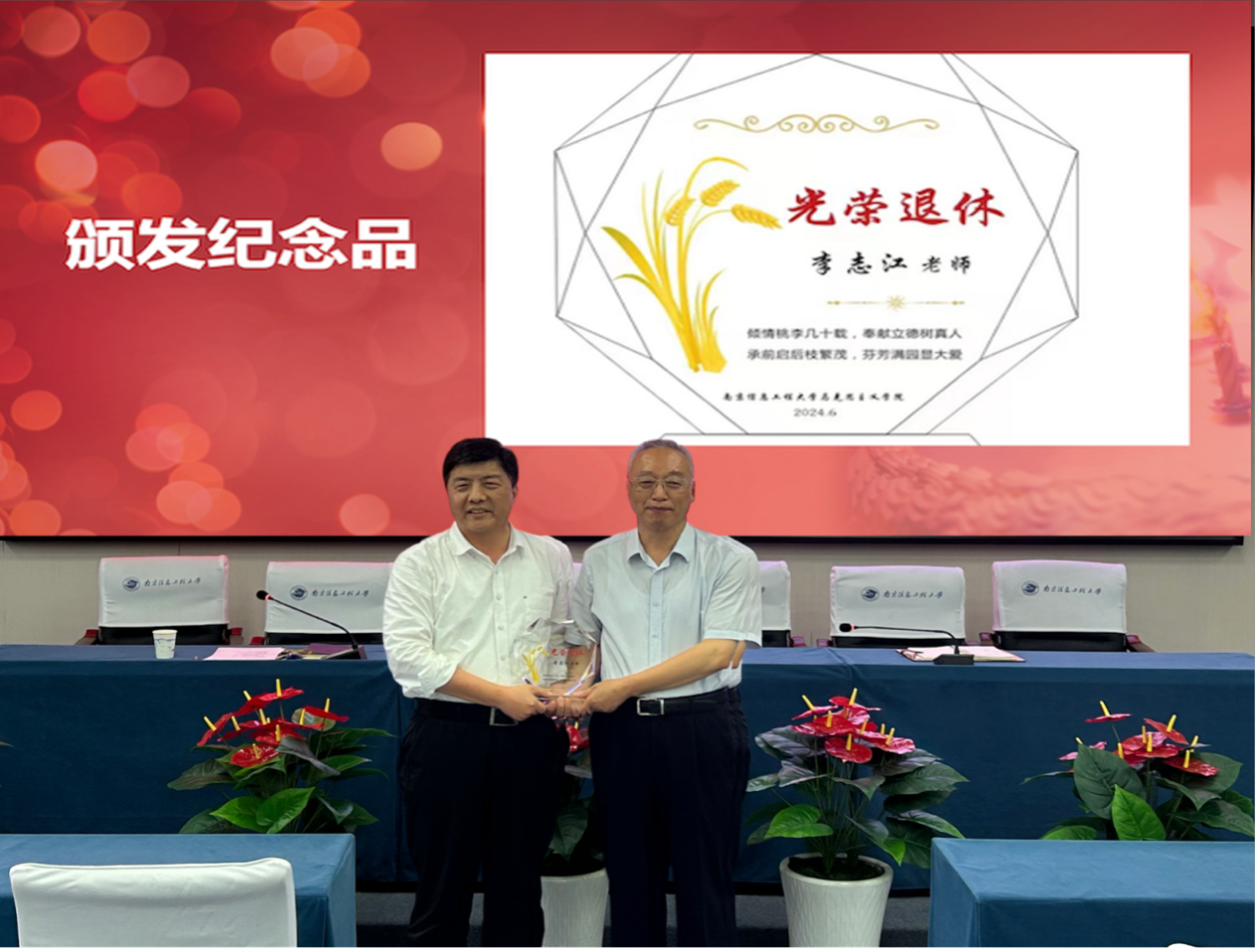 学院院长张天勇深情回顾了李志江教授在学院的工作历程,对其深厚的学术造诣、严谨的治学态度以及对学生和青年教师的悉心指导表示了高度赞扬。张院长代表学院向李教授颁发了荣誉证书和精心准备的荣休纪念品,以此表达对李志江教授辛勤付出的感激之情。葛昕明书记代表学院向李志江教授颁发了关工委常务副主任和特邀党建组织员聘书。青年教师代表周丽和学生代表怀丽分别上台为李教授献上鲜花。李教授的研究生们还精心准备了一本满载回忆的纪念册,她们用鲜花和纪念册表达对李教授的敬意和感激之情,同时也送上了最真挚的祝福。