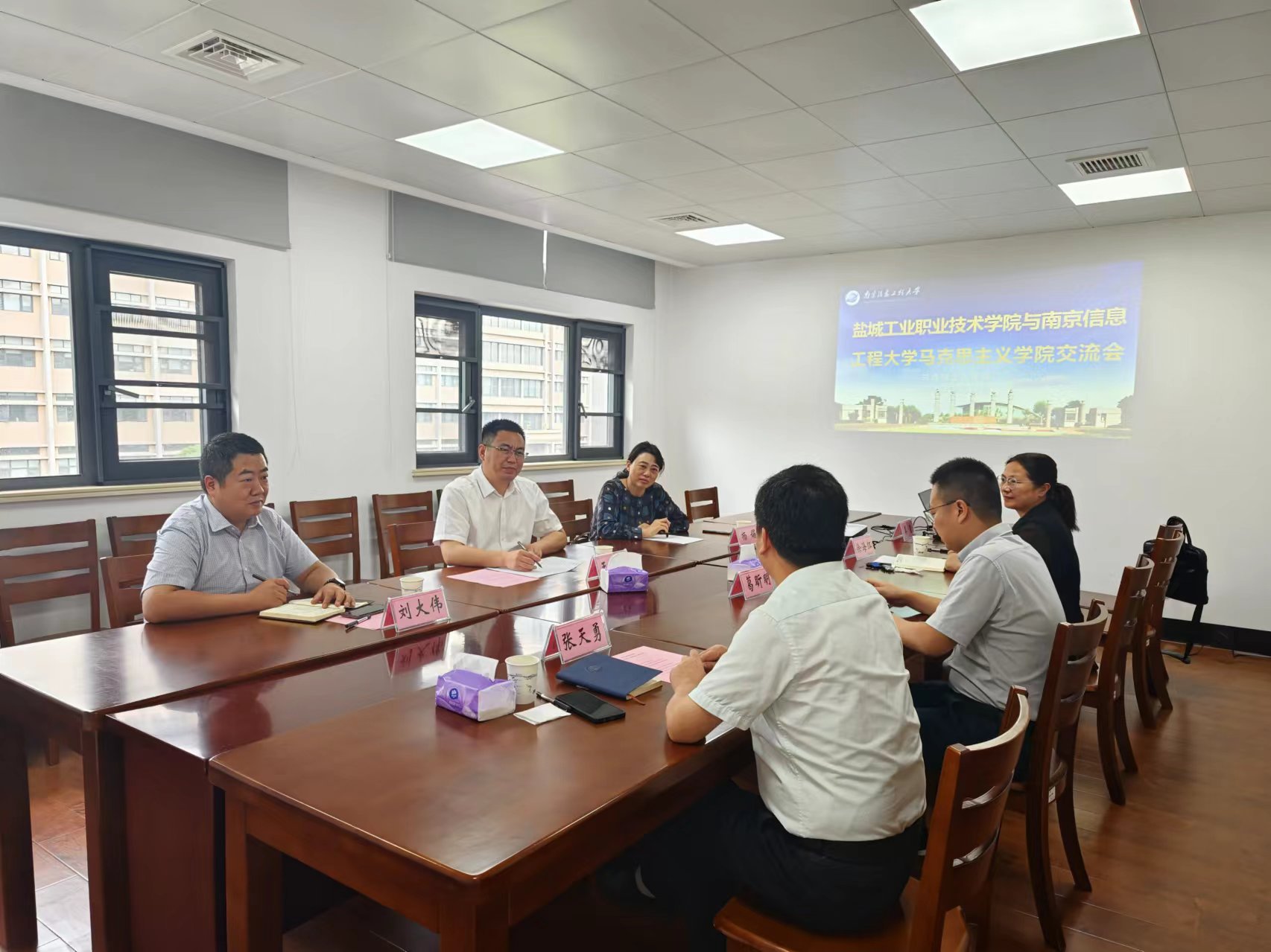 9月12日上午9:00,盐城工业职业技术学院副校长王曙东、马院院长杨娟、副院长刘大伟一行3人到马克思主义学院调研示范马院建设相关工作。学院院长张天勇、党委书记葛昕明、副院长徐海红和教学秘书秦童出席交流会。