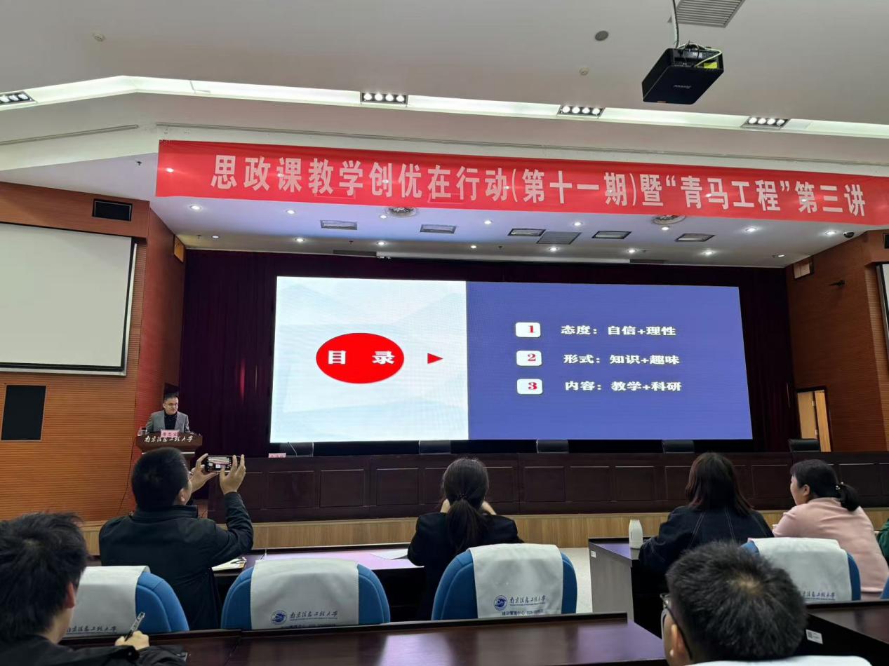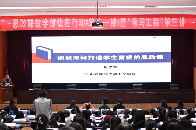 1025日下午,校团委、马克思主义学院在气象楼报告厅举办思政课教学创优在行动(第十一期)教学展示暨“青马工程”第三讲活动。活动由马克思主义学院副院长徐海红主持。本次活动特邀江南大学马克思主义学院副院长唐忠宝教授做报告,马克思主义学院教师、“青马工程”培训班学员、思想政治教育(师范)专业24级本科生全体同学参会学习和交流。