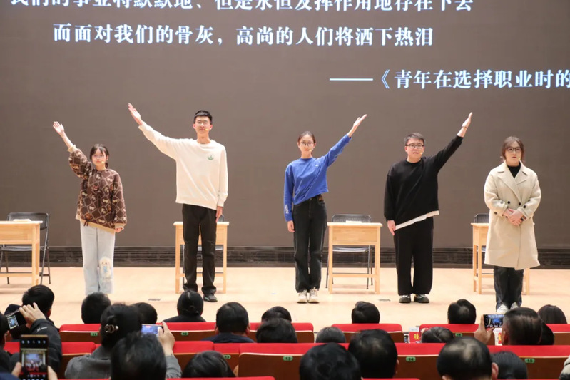 在展评会现场,南京信息工程大学灼目戏剧社的学生们带来了一场别开生面的思政情景剧《“最后”一课》。该剧将思政课教师、辅导员同青年大学生的沟通交流搬上了舞台,通过生动的表演和感人的情节,刻画了新时代青年大学生的思考、转变与成长。这种“戏剧思政”的教学方式,不仅让学生们更加深入地理解了思政课程的内容,更在思想、情感和行为上产生了深远的影响。