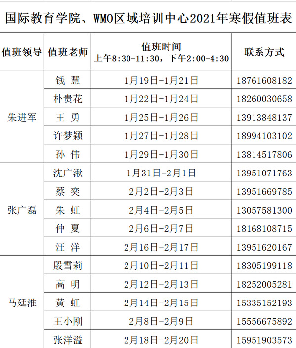 国际教育学院、WMO区域培训中心2021年寒假值班表