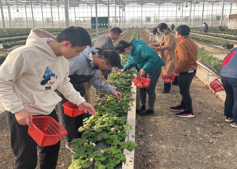 在生态园里,教职工们一边采草莓一边互相交流,体验采摘草莓、品尝鲜果的乐趣,充分感受农业特色产业的发展。