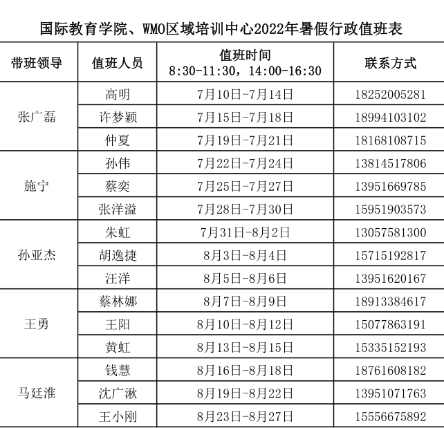 国际教育学院、WMO区域培训中心2022年暑假行政值班表