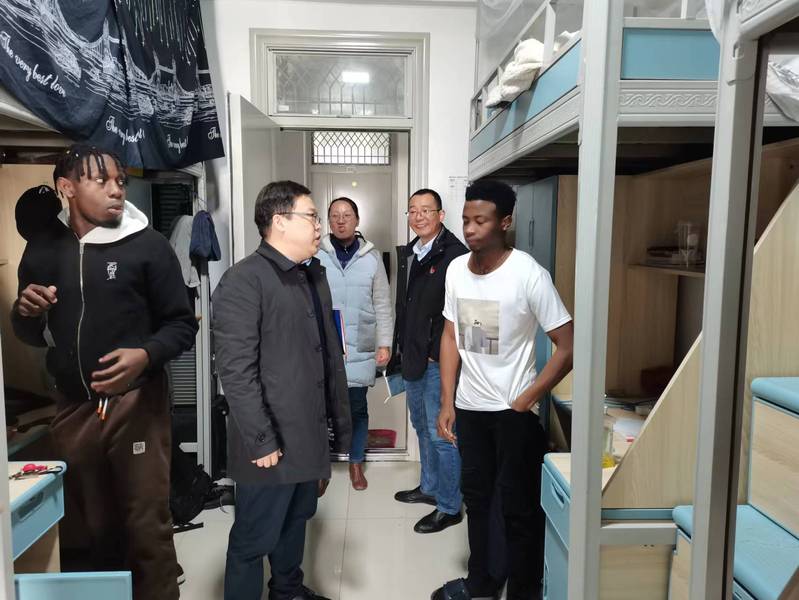 李岩一行首先走访了园区留学生宿舍,并与留学生进行了亲切交谈。在检查留学生宿舍公共厨房、洗衣房、自习室等公共区域的使用情况时,李岩向学生强调宿舍楼内要保持卫生整洁,注意用电安全。随后,李岩一行与园区留学生代表进行了亲切座谈,深入了解了园区留学生在学习、生活、实习等方面的问题与实际困难,就所反映问题从政策层面进行耐心解释,并提出切实可行的建议,同时要求对不能立即解决的问题要做好记录,会后积极与相关部门反映、协调、解决,真正体现学校“以生为本”的教管理念。最后,参与座谈会的师生合影留念。