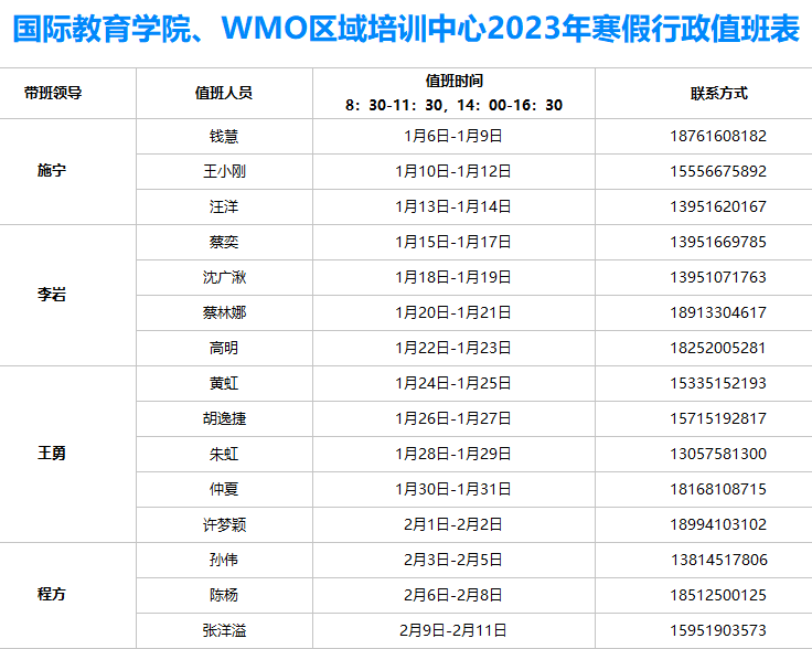 国际教育学院、WMO区域培训中心2023年寒假行政值班表