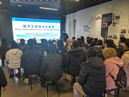 为加强来华留学生法制宣传,全面落实假期安全教育,1月20日下午,国际教育学院联合校保卫处为寒假留校留学生开展了寒假安全教育宣讲。盘城派出所副所长薛志强、二级警长孙跃、校保卫处副处长付兆锋,国际教育学院副院长王勇出席了此次活动。