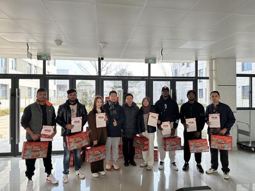 2月9日上午,新春佳节,除夕当日,国际教育学院党总支副书记(主持工作)李岩带队来到金牛湖产教融合园区,慰问春节期间留校学生和在岗后勤员工,送去暖心慰问品,并向他们致以新春的美好祝福。