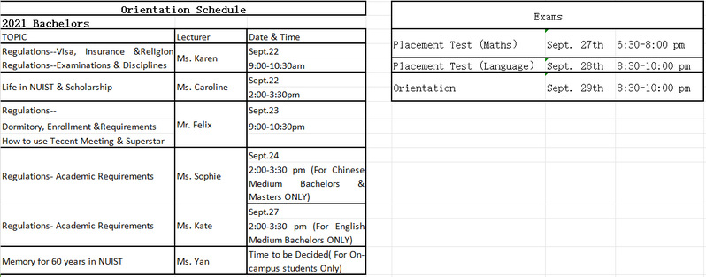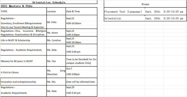 For all the students who joined in NUIST this semester, there will be Orientation Class since September 22nd. It is a compulsory course and will have a final exam after the classes. Please follow the schedule below and attend the classes on time.