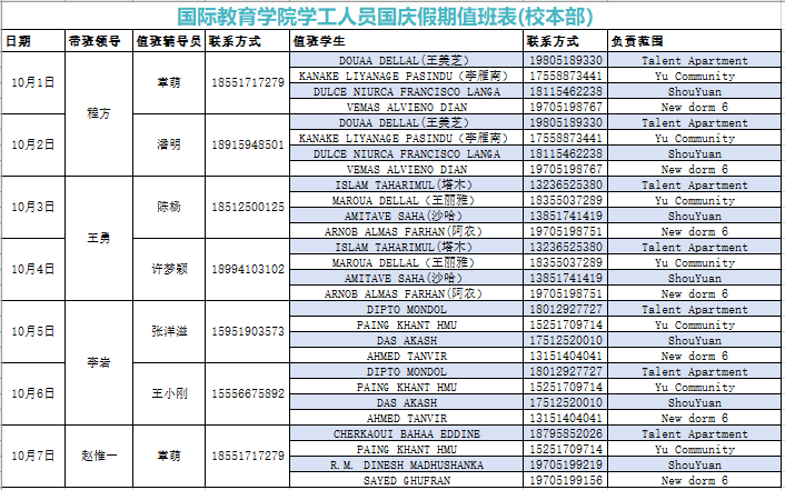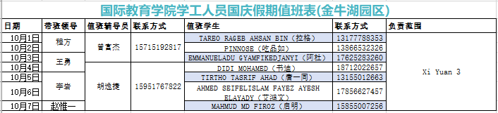 2024年国庆节期间学工人员值班表