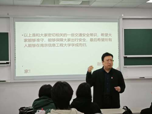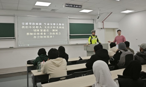为进一步增强我校留学生的交通安全意识,避免交通事故的发生,保证学生生命财产安全,11月1日下午,国教院特邀江北新区交警一大队盘城中队中队长封浩为留学生们开展了交通安全讲座,学院党总支书记李岩出席讲座现场。