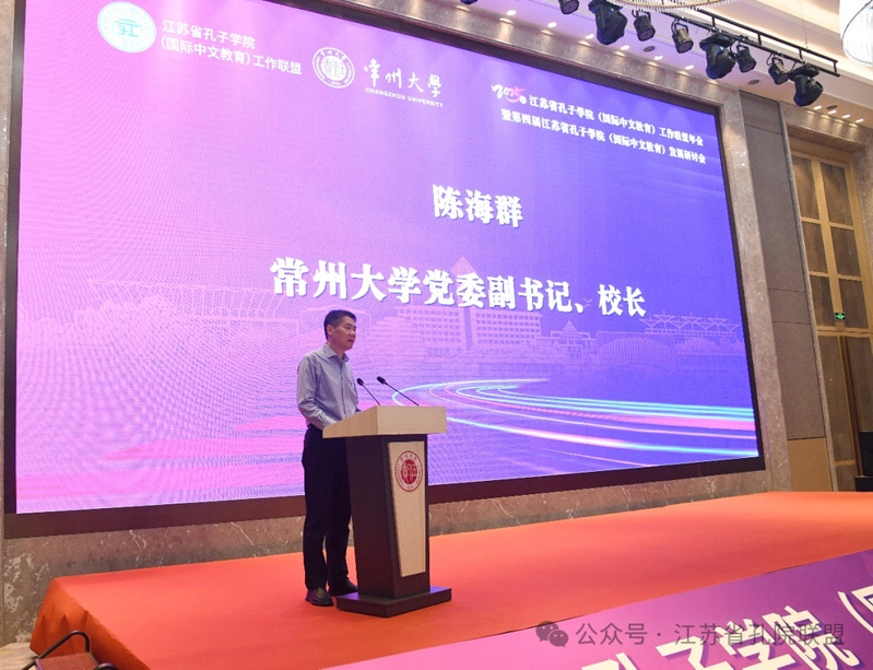 5月28日,江苏省孔子学院(国际中文教育)工作联盟年会暨江苏省孔子学院(国际中文教育)发展研讨会在常州大学举办。中国国际中文教育基金会政策与发展部副主任丁洋、教育部中外语言合作交流中心发展规划处副处长毛彦成、江苏省教育厅对外合作与交流处二级调研员庾卫东,江苏省孔子学院工作联盟各高校领导、国际中文教育管理部门负责人和教师科研人员代表等80余人参加会议。常州大学党委副书记、校长陈海群出席活动并致辞。