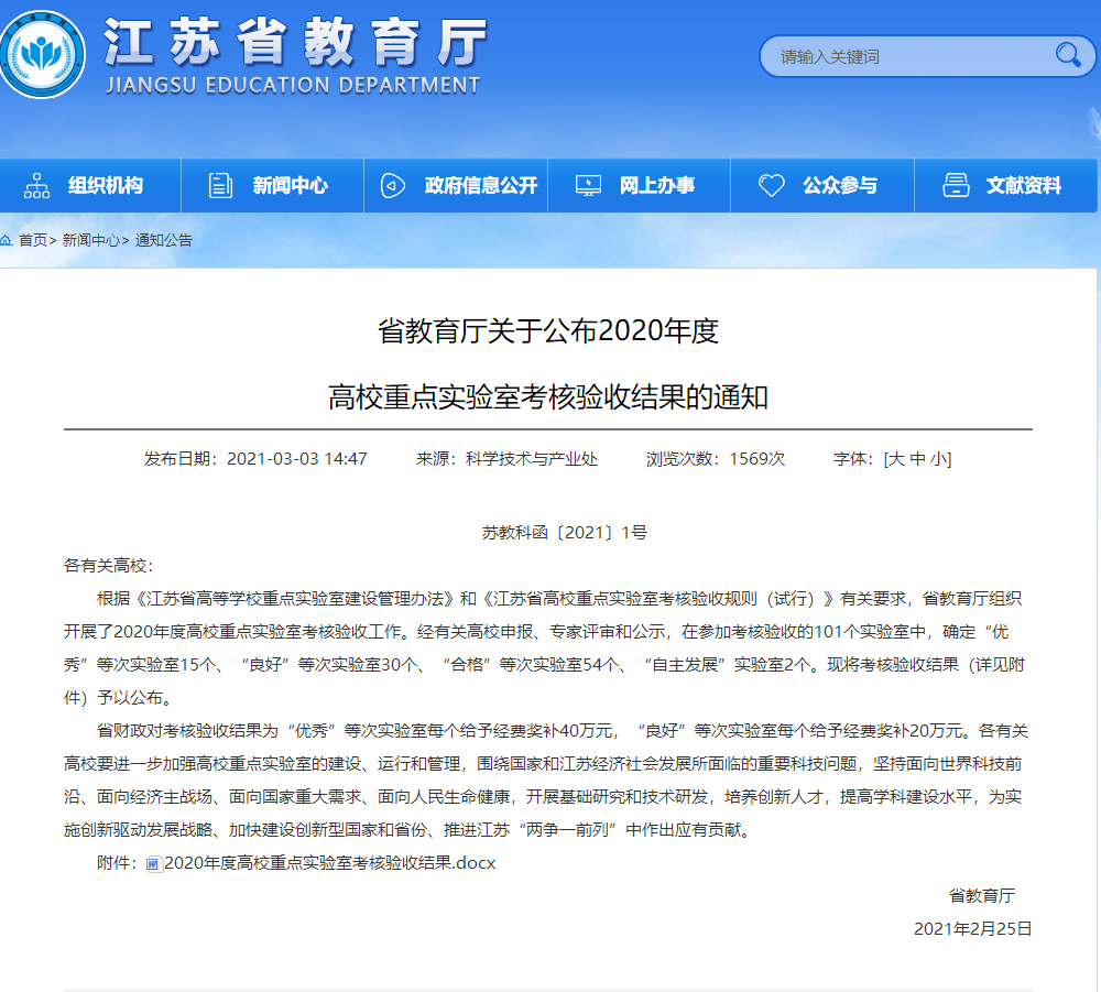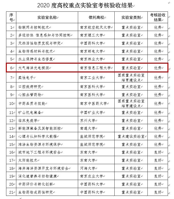 目前,省教育厅公布了关于《省教育厅关于公布2020年度高校重点实验室考核验收结果的通知》(苏教科函〔2021〕1号)。我校大气海洋光电探测重点实验室顺利通过省教育厅考核验收并被评为“优秀”。全省一共101个实验室参加此次考核验收,其中“优秀”等次实验室仅15个。