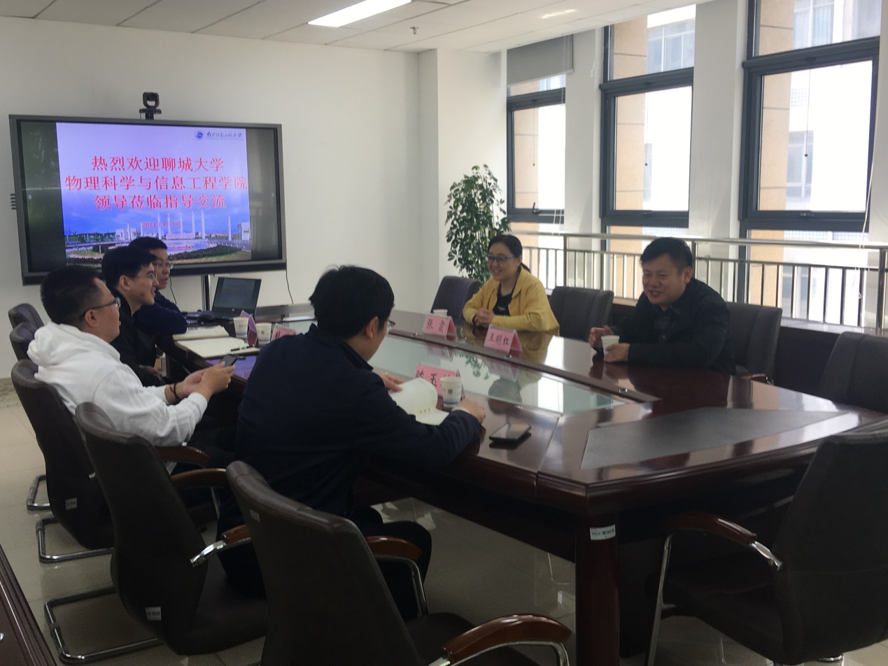 刘博院长首先对聊城大学物理科学与信息工程学院张霞、王明红两位副院长的到来表示了热烈欢迎,简要介绍了学院专业设置、学科发展、师资队伍建设等的总体情况。张霞副院长重点介绍了聊城大学物理科学与信息工程学院的发展概况,希望今后能够进一步加强双方的合作与交流。
