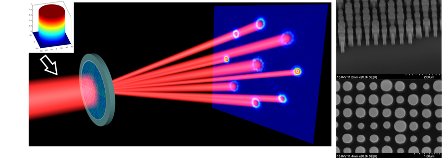 通过不同半径的微纳米圆柱实现不同相位调控,设计高维OAM模式复用与解复用器件,在不同出射的方向可以产生不同阶数的OAM模式,实现高维OAM模式同时产生、复用以及解复用,实现高维信息传输,提升信息传输容量、效率以及鲁棒性。