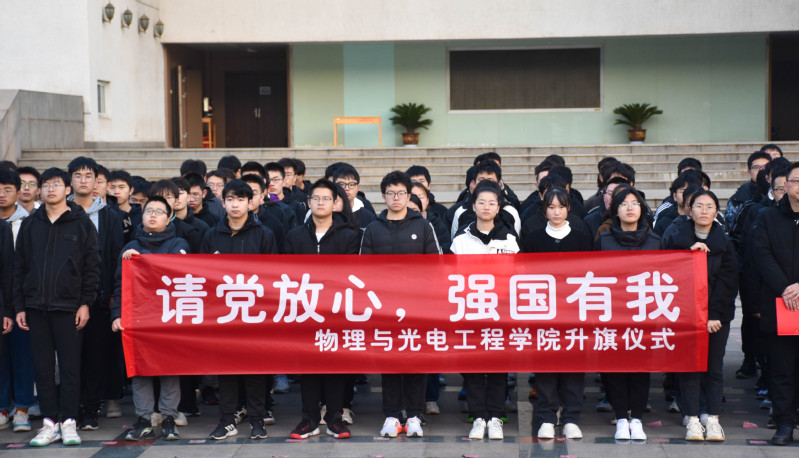 11月29日,物理与光电工程学院于滨江楼南广场隆重举行庄严而又神圣的升旗仪式。升旗仪式由管瑞主持,学院副院长赵德林、学办副主任孙英男、院团委书记张龙华及各学生代表共计200余人参加了升旗仪式。