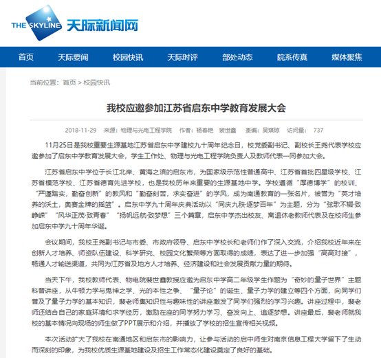 支部党员深入企业开展合作和志愿服务活动,支部党员分别与南京波长光电科技股份有限公司、南京熊猫电子制造有限公司、南京洛普股份有限公司、常熟卓辉光电科技股份有限公司等企业积极开展光电技术开发与产学研合作。同时,支部党员教师坚持每学期开展“教授进中学”“科普进校园”等社会实践和志愿服务活动。在党员教师的带动和影响下,多名研究生赴广西、宁夏边远地区支教,多名本科生参加西部计划、苏北计划等志愿服务项目,大大提升了学校的社会影响力和美誉度。